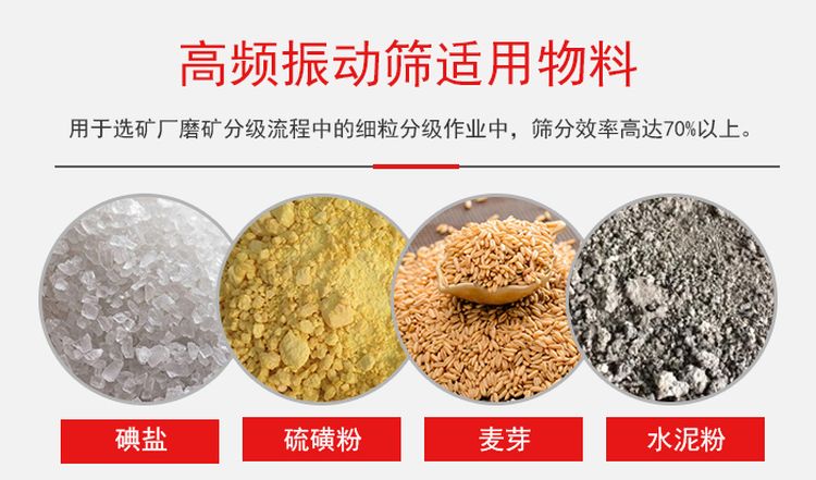 而高頻振動篩用于選礦廠磨礦分級流程中的細(xì)粒分級作業(yè),在適當(dāng)?shù)慕o料濃度、給料粒度(-200目粒級含量)、以及需求篩下粒度與給料粒度之差小于30個百分點的條件下,篩分效率高達(dá)70%以上。