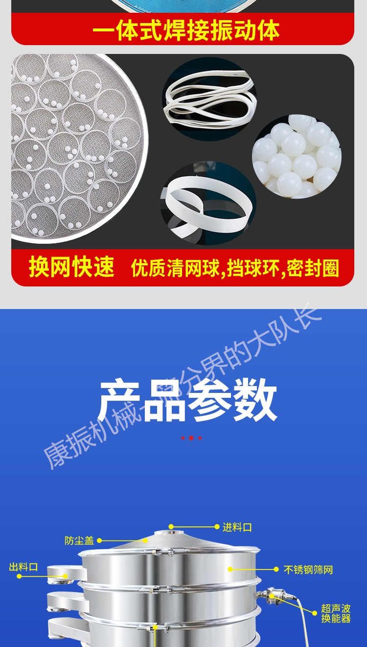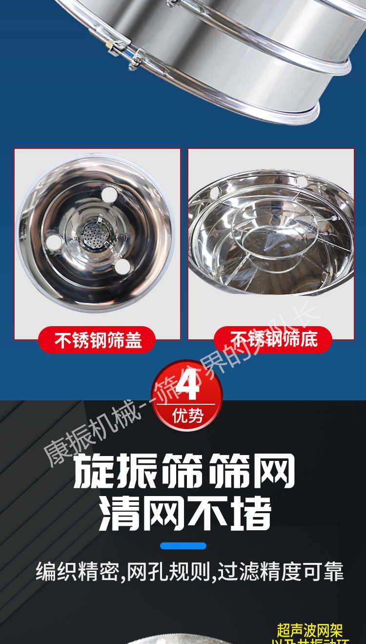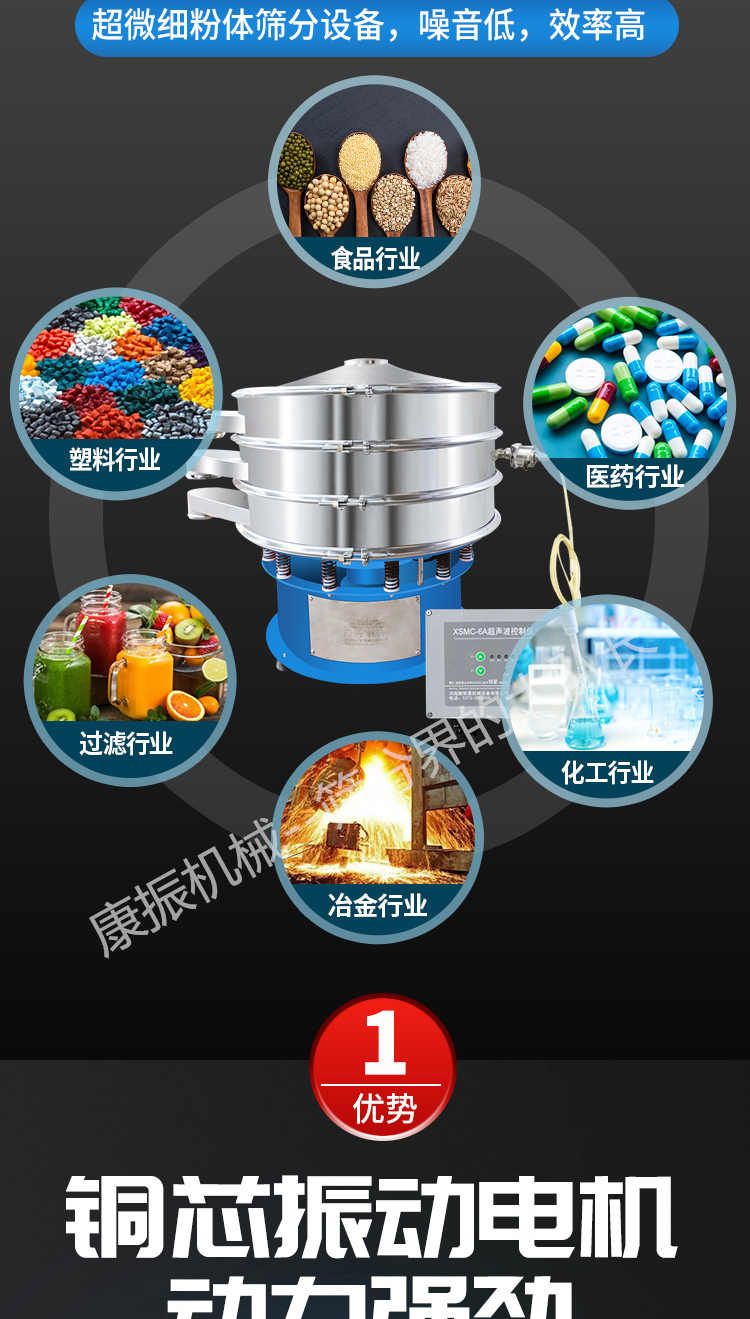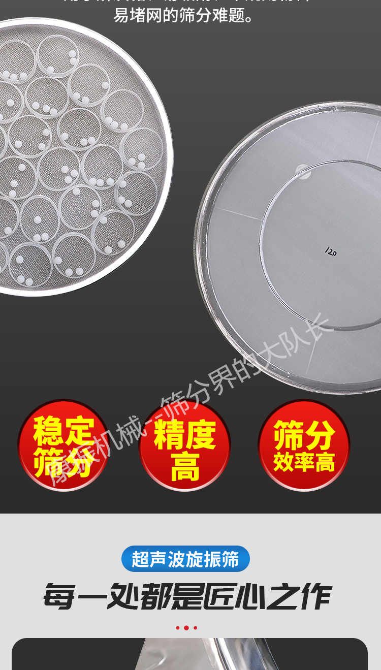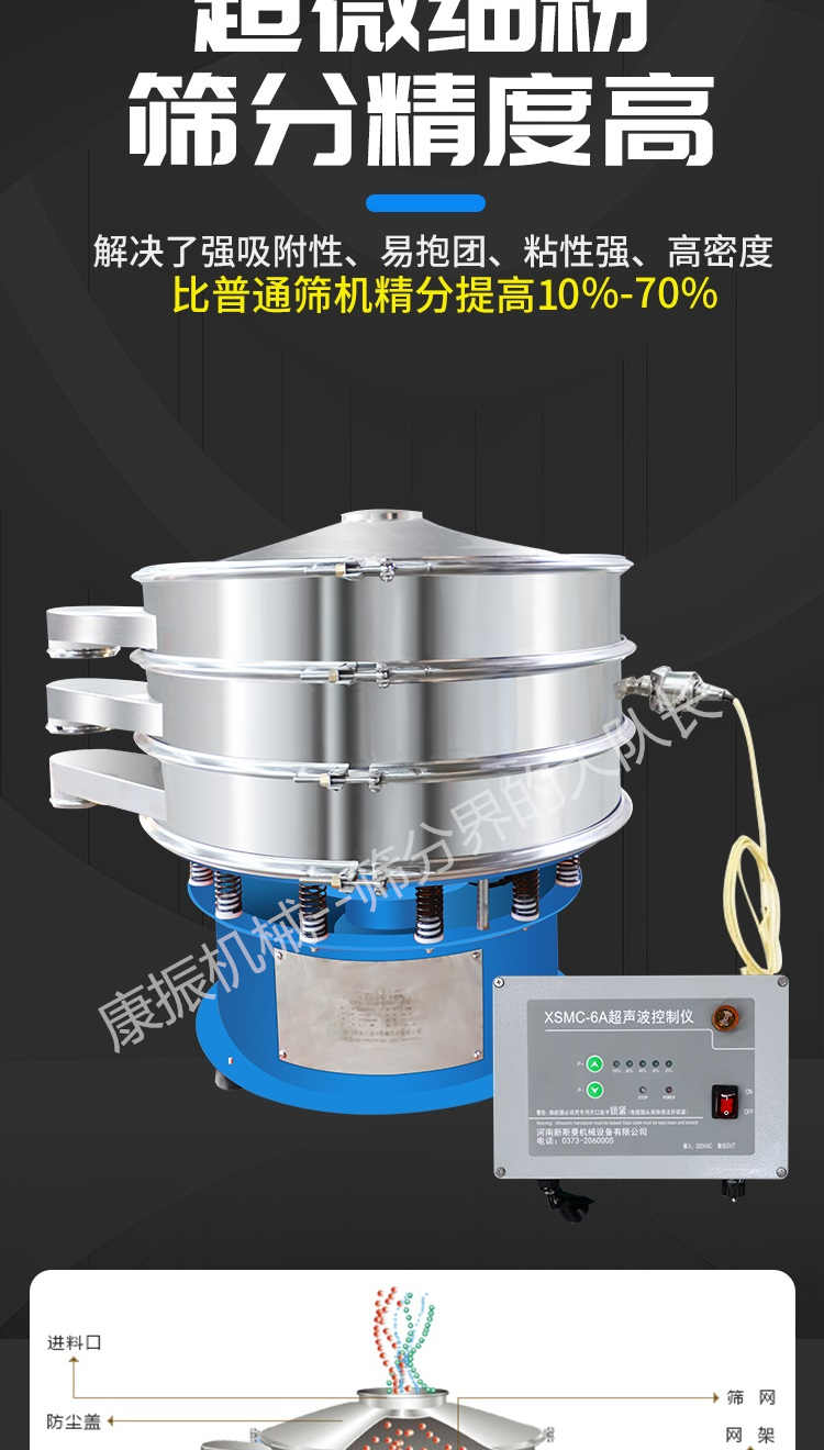 超聲波振動(dòng)篩是在旋振篩的基礎(chǔ)上引入了超聲波清網(wǎng)裝置,通過(guò)將220V、50Hz或110V、60Hz電能轉(zhuǎn)化為18KHz的高頻電能,輸入超聲換能器,將其變成18KHz機(jī)械振動(dòng),從而達(dá)到高篩分和迅速清網(wǎng)的目的,使超微細(xì)粉篩分成為易事。該系統(tǒng)在傳統(tǒng)的振動(dòng)篩基礎(chǔ)上在篩網(wǎng)上引入一個(gè)低振幅、高頻率的超聲振動(dòng)波(機(jī)械波),以改善超微細(xì)粉體的篩分性能。特別適合高附加值精細(xì)粉體的用戶使用。超聲波篩分系統(tǒng)是一種簡(jiǎn)單實(shí)用、可靠的篩分系統(tǒng),是當(dāng)前網(wǎng)孔堵塞的有效的解決方法??蓮V泛應(yīng)用于制藥、冶金、化工、選礦、食品等要求精細(xì)篩分過(guò)濾的行業(yè),篩分過(guò)濾精度高,有效解決因團(tuán)聚、靜電、強(qiáng)吸附性卡堵網(wǎng)孔等篩分難題,是國(guó)內(nèi)篩分行業(yè)的一項(xiàng)重大技術(shù)突破。
