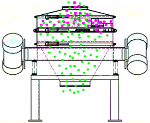 (2-2)直排篩工作原理:該系列篩機是利用兩側臥式振動電機為激振源,振動電機置于機體一側,物料進入設備內(nèi)部后,受振動源作用力在篩面上做橢圓運動軌跡.快速并往復完成過網(wǎng)動作的同時,振動力能往并連續(xù)的對物料產(chǎn)生剝離、打散及重組的作用,從而使物料快速過網(wǎng),不能過網(wǎng)物料則按設備運動軌跡由篩上排料口排出,完成篩分作業(yè)過程;