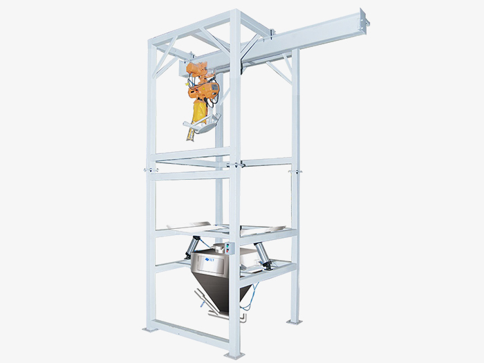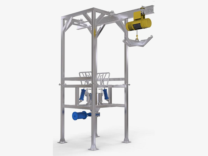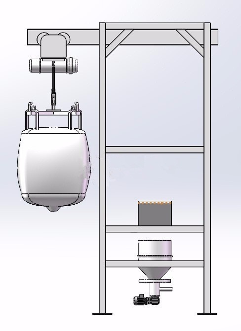 主體結(jié)構(gòu):卸料站框架支撐結(jié)構(gòu)、噸袋起重裝置、噸袋吊架、噸袋支撐按摩板、袋口控制閥、密封裝置。