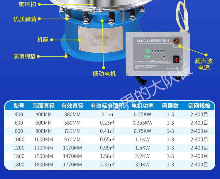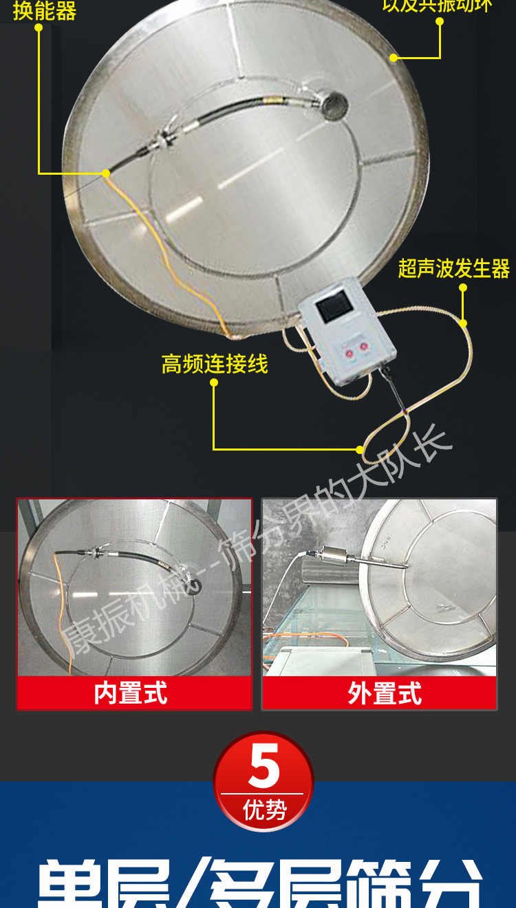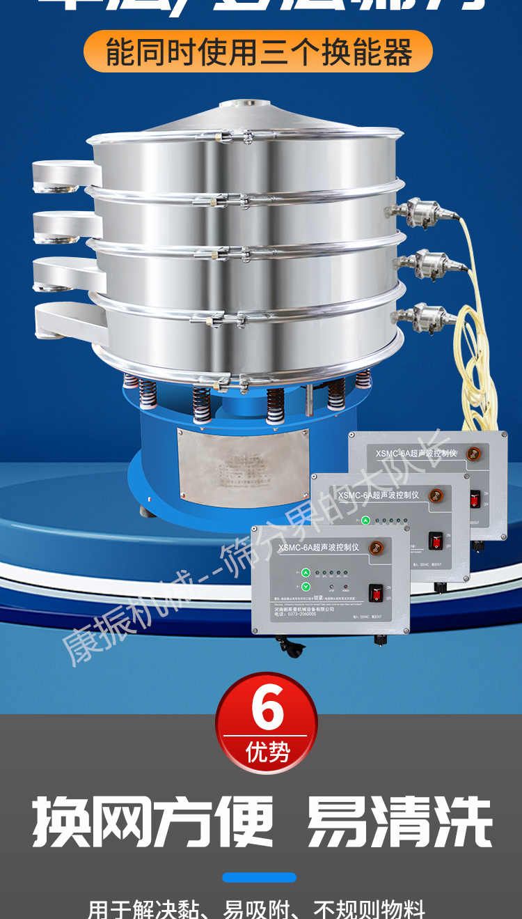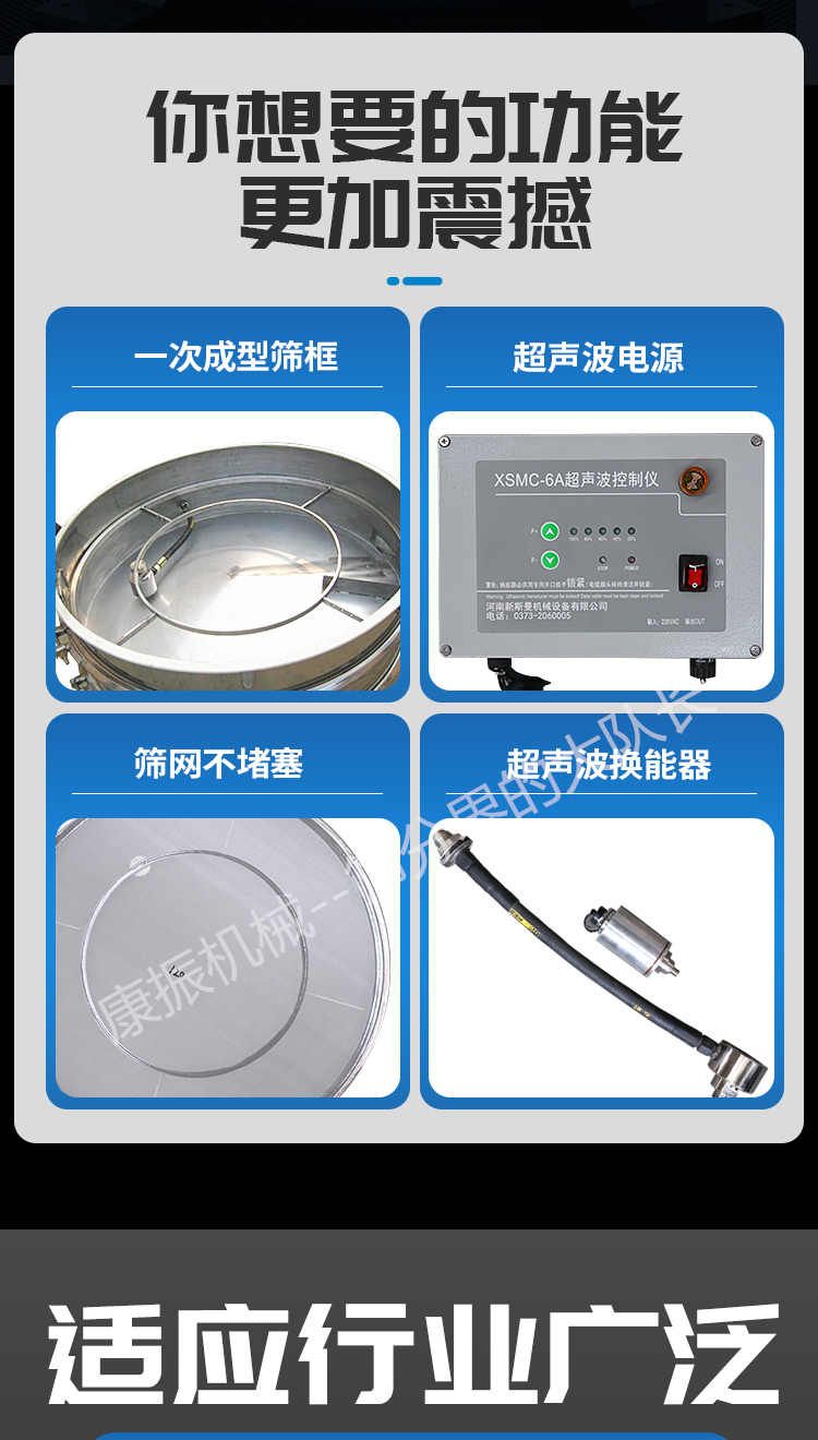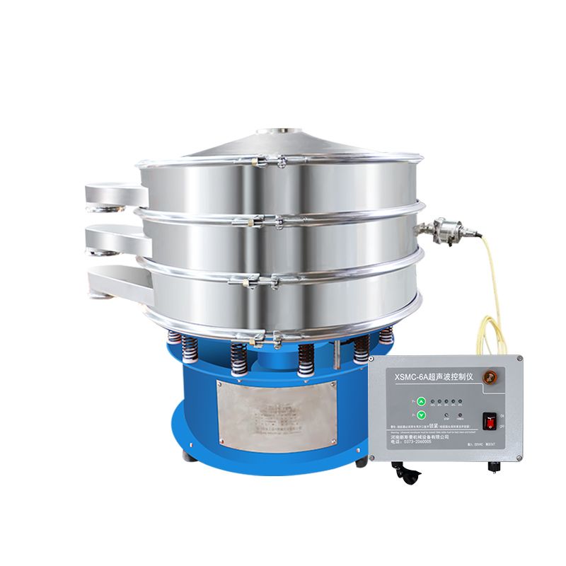 超聲波振動(dòng)篩是在旋振篩的基礎(chǔ)上引入了超聲波清網(wǎng)裝置,通過(guò)將220V、50Hz或110V、60Hz電能轉(zhuǎn)化為18KHz的高頻電能,輸入超聲換能器,將其變成18KHz機(jī)械振動(dòng),從而達(dá)到高篩分和迅速清網(wǎng)的目的,使超微細(xì)粉篩分成為易事。該系統(tǒng)在傳統(tǒng)的振動(dòng)篩基礎(chǔ)上在篩網(wǎng)上引入一個(gè)低振幅、高頻率的超聲振動(dòng)波(機(jī)械波),以改善超微細(xì)粉體的篩分性能。特別適合高附加值精細(xì)粉體的用戶使用。超聲波篩分系統(tǒng)是一種簡(jiǎn)單實(shí)用、可靠的篩分系統(tǒng),是當(dāng)前網(wǎng)孔堵塞的有效的解決方法??蓮V泛應(yīng)用于制藥、冶金、化工、選礦、食品等要求精細(xì)篩分過(guò)濾的行業(yè),篩分過(guò)濾精度高,有效解決因團(tuán)聚、靜電、強(qiáng)吸附性卡堵網(wǎng)孔等篩分難題,是國(guó)內(nèi)篩分行業(yè)的一項(xiàng)重大技術(shù)突破。